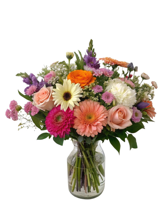 Vibrant flower base with a mix of seasonal blooms arranged in a stylish vase. Flowers...
