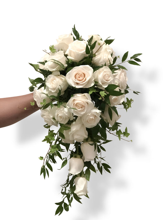 A cascading bridal bouquet featuring elegant white roses and fresh greenery, bringing movement and sophistication....