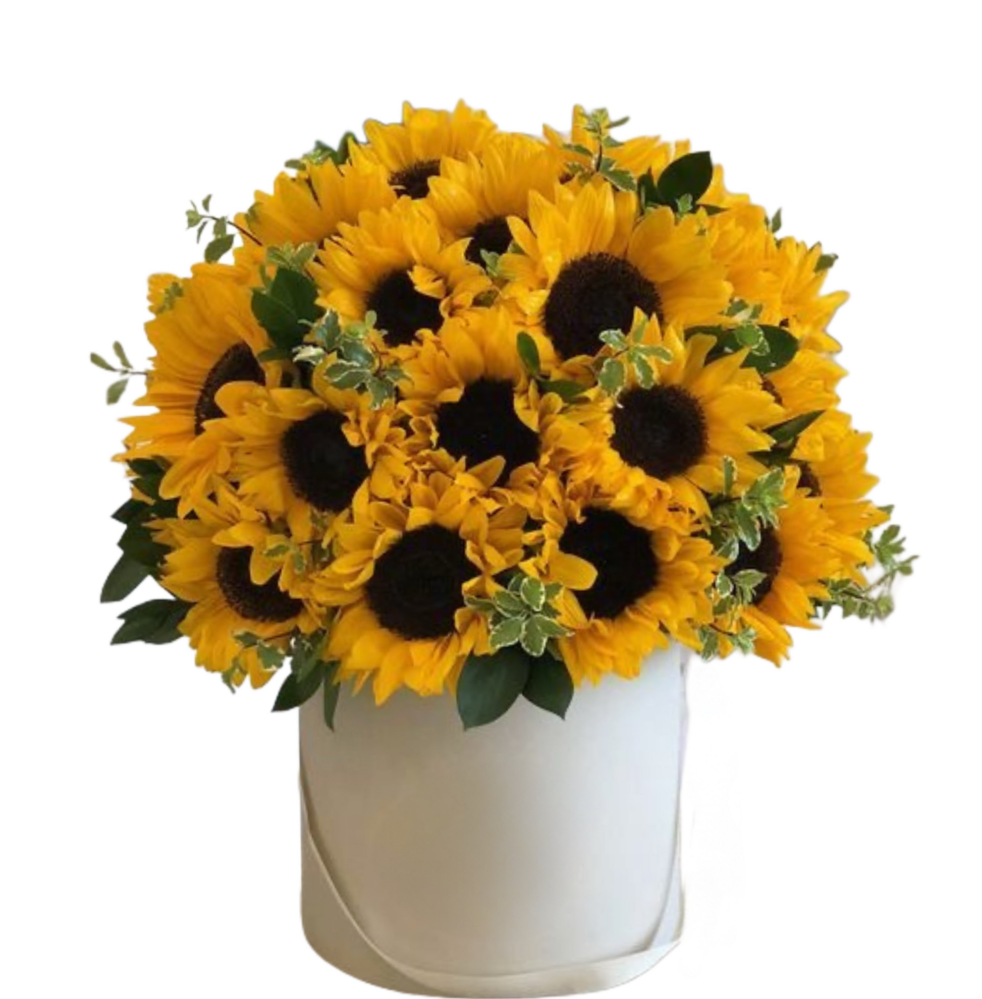 Cylindrical box filled with radiant sunflowers, designed with a modern and elegant touch. A perfect gift to brighten any occasion with warmth and style.