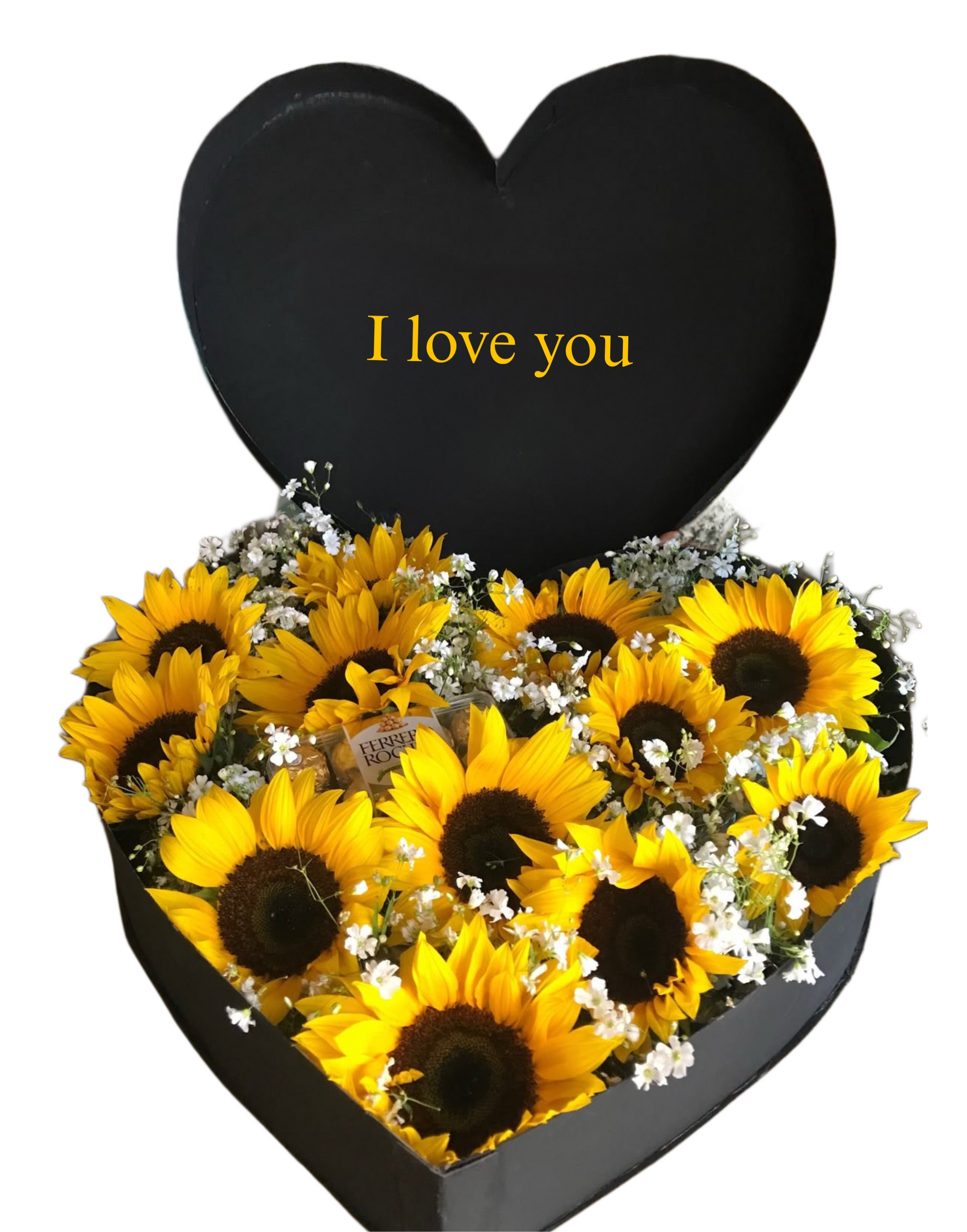 Heart-shaped black box filled with vibrant sunflowers and delicate baby’s breath. A bold yet elegant design that combines sunshine and sophistication – perfect for making a lasting impression.
